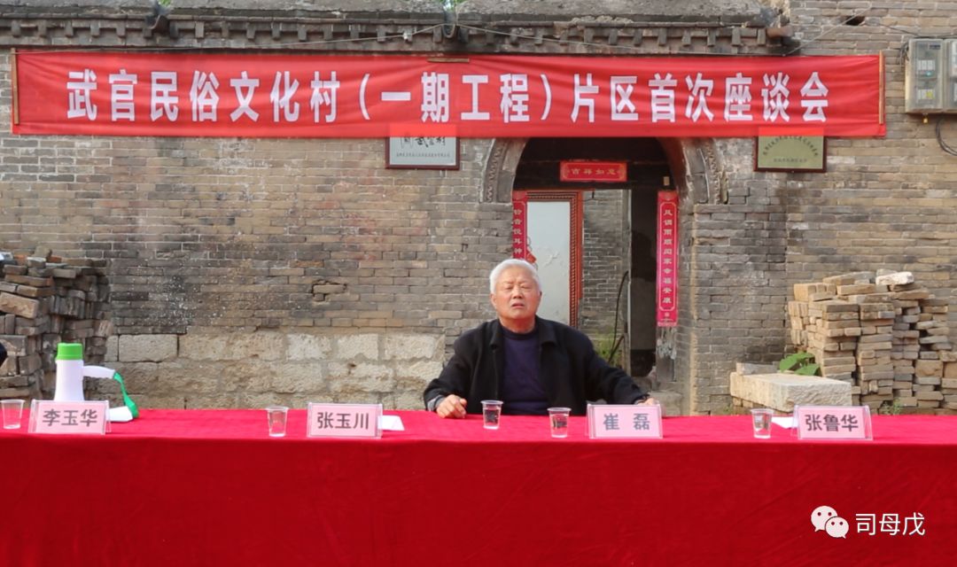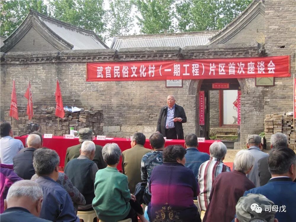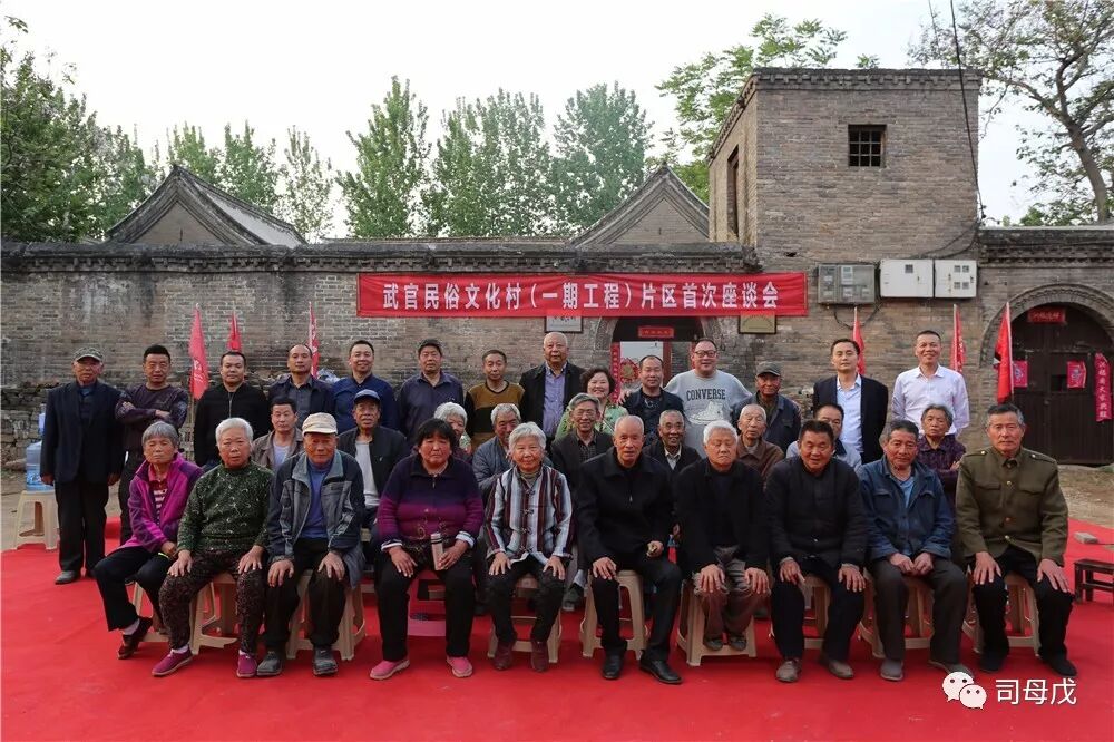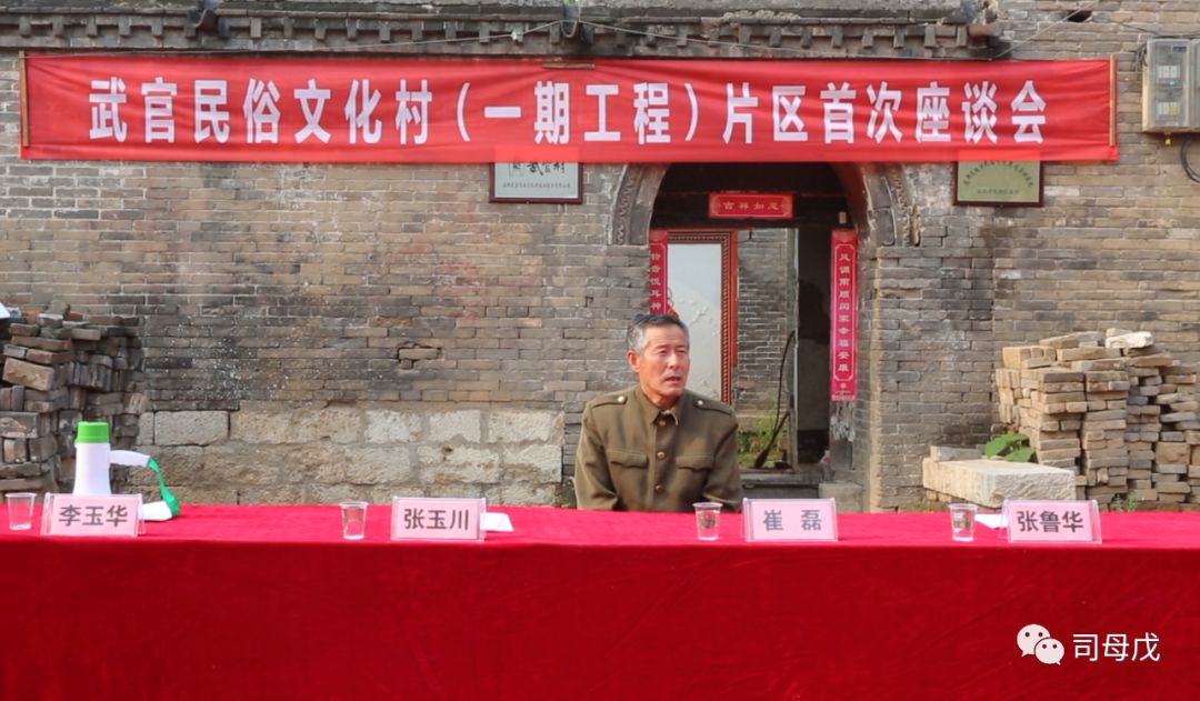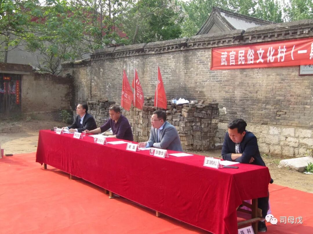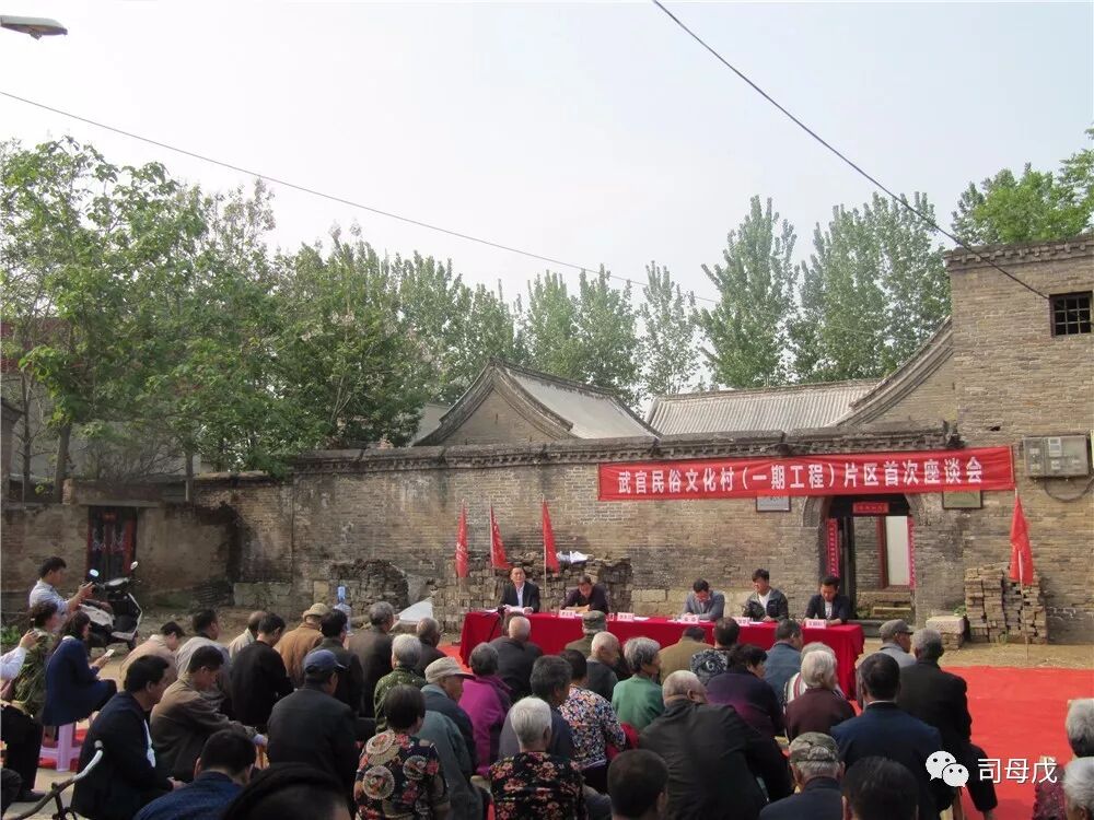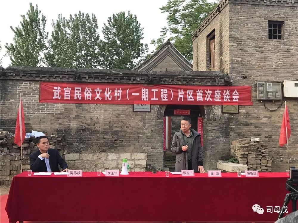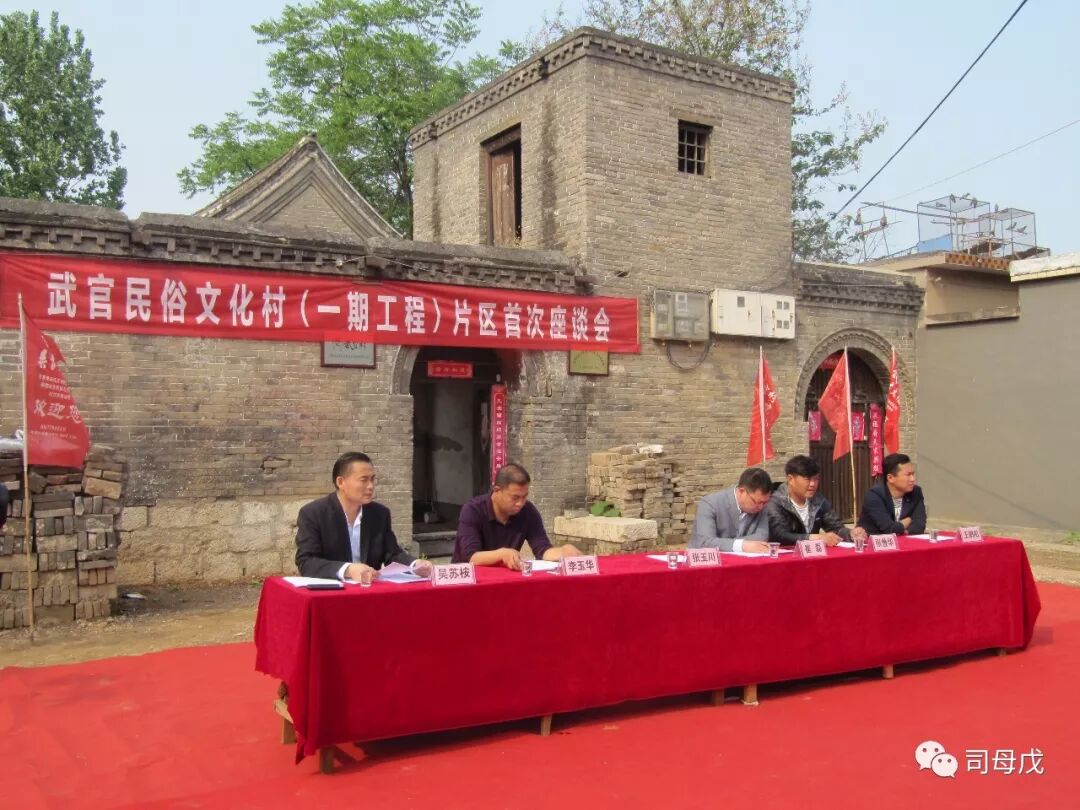 2018年4月24日下午,武官民俗文化村(一期工程)片区首次座谈会在武官村召开。殷都区文广新旅局局长张玉川、北蒙办事处副书记崔磊、北蒙办事处武装部部长李玉华、北蒙办事处主管武官村干部王鹏松、武官村党支部书记、村委会主任张鲁华等领导以及安阳市知音文化传播有限公司总经理刘海芳、安阳市会友美食餐饮有限公司总经理刘国庆、司母戊文化传播有限公司董事长吴苏桉还有武官民俗文化村(一期工程)片区内村民齐聚武官村吴家大院前参加了此次座谈会。