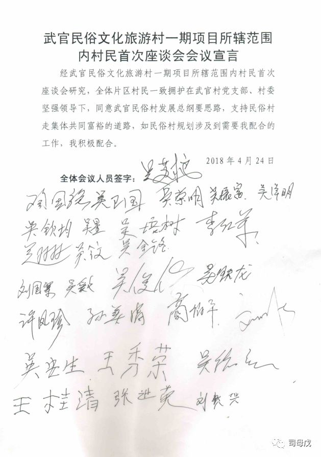 会后,参会村民纷纷在大会宣言上郑重签署了自己的姓名,大家一致表示要支持拥护在武官村党支部、村委会坚强领导下,同意武官民俗村发展总纲要思路,支持民俗村走集体共同富裕的道路,将会积极配合民俗村建设涉及到的工作内容。